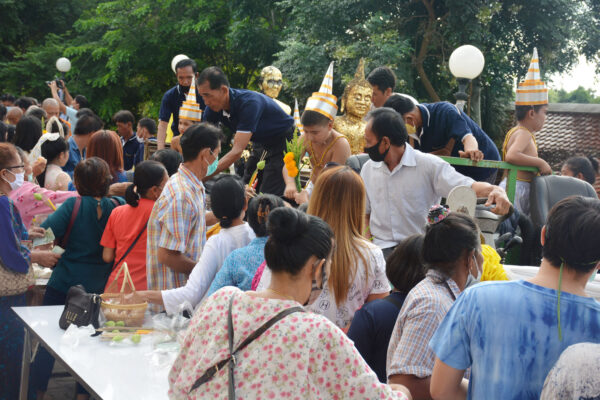 ซึ่งใน ช่วงเทศกาลเข้าพรรษา ชาวบ้านที่มีข้อข้องใจ ต้องอาศัยบารมีสิ่งศักดิ์สิทธิ์เพื่อบนบานศาลกล่าว เมื่อได้สมปรารถนาแล้ว แต่ยังติดที่อยู่ในพรรษากาลทำให้แก้บนไม่ได้ พอถึงเทศกาลงานออกพรรษา ชาวบ้านก็จะแก้บนหลวงพ่อโตด้วยขนมครก ในวันหลังจากออกพรรษาเป็นประเพณีสืบต่อกันมา โดยชาวบ้าน จะนำข้าวสารมอาหารแห้ง พร้อมทั้งขนมครก 8 สี มาร่วมกันตักบาตร