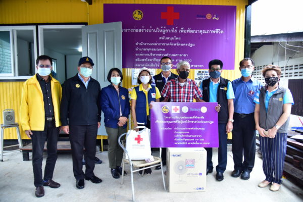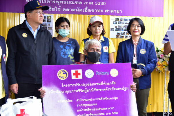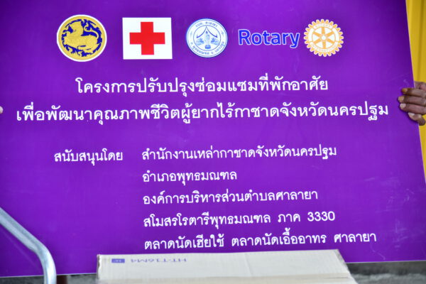 วันที่ 8 ตุลาคม 2563 นางวราภรณ์ เจริญศิริโชติ นายกเหล่ากาชาดจังหวัดนครปฐม พร้อมด้วยกรรมการและสมาชิกเหล่ากาชาดจังหวัดนครปฐม ปลัดจังหวัดนครปฐม นายอำเภอพุทธมณฑล ผู้บริหาร อบต.ศาลายา และสโมสรโรตารีพุทธมณฑลภาค 3330 ร่วมมอบบ้านกาชาดให้กับผู้ยากไร้ ตามโครงการปรับปรุงซ่อมแซมที่พักอาศัยเพื่อพัฒนาคุณภาพชีวิตผู้ยากไร้ของเหล่ากาชาดจังหวัดนครปฐม โดยมอบบ้านให้กับ นายสอง ชาวอิสาร บ้านเลขที่ 171/4 หมู่ที่ 5 ตำบลศาลายา อำเภอพุทธมณฑล จังหวัดนครปฐม ซึ่งเป็นผู้ประพฤติดีและช่วยเหลือสังคมมาโดยตลอด จนมาป่วยกล้ามเนื้ออ่อนแรง สภาพที่อยู่อาศัยทรุดโทรม ทำให้มีความเป็นอยู่ยากลำบาก