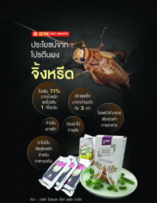 “ปัจจุบันมีบริษัทไทยและบริษัทต่างชาติลงทุนทำฟาร์มเพาะเลี้ยงในพื้นที่ภาคเหนือ ภาคตะวันออกเฉียงเหนือ และภาคกลางและตั้งโรงงานแปรรูปแมลงเพื่อส่งออกมีแบรนด์ของตัวเองเช่นแบรนด์ ProteGo ผงโปรตีนจากจิ้งหรีด (Cricket Powder)ที่ขอนแก่น และบริษัท คริกเกท แลบ จำกัด ตั้งอยู่ที่อำเภอสารภี จังหวัดเชียงใหม่ เป็นฟาร์มจิ้งหรีดระบบปิดที่ใหญ่ที่สุดแห่งหนึ่งของโลกและยังเป็นโรงงานผู้ผลิตผงโปรตีนจากจิ้งหรีดตามมาตรฐานยุโรปเช่นเดียวกับบริษัทโกลบอล บั๊คที่อำเภอหัวหิน จังหวัดประจวบคีรีขันธ์ นับเป็นสินค้าเกษตรและอาหารที่มีอนาคตและตอบโจทย์ความต้องการโปรตีนรูปแบบใหม่ที่มีโภชนาการสูงประเภทอาหารใหม่(Novel Food)ของผู้บริโภคทั้งในและต่างประเทศ”