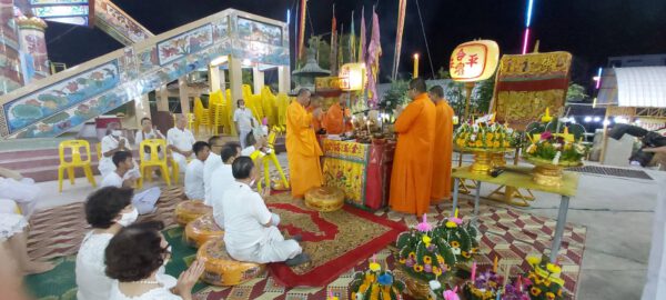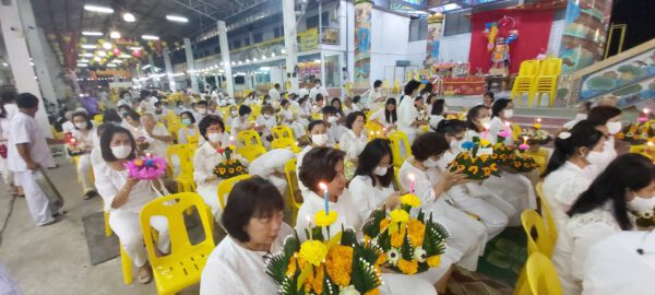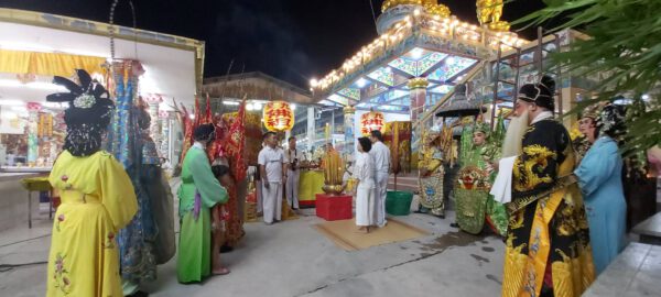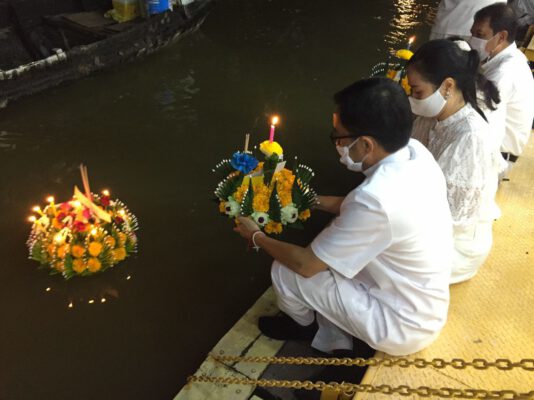 โดยมีชาวไทยเชื้อสายจีนจำนวนมาก แต่งกายด้วยชุดสุภาพสีขาว ร่วมกันลอย กระทงในแม่น้ำท่าจีนที่ไหลผ่านโรงเจ
