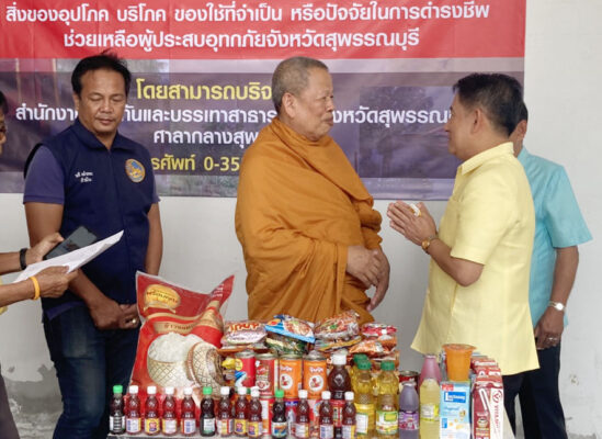 นำสิ่งของเครื่องอุปโภค บริโภคประกอบด้วย บะหมี่กึงสำเร็จรูป ข้าวสาร ปลากระป๋อง น้ำปลา น้ำมันพืช นมกล่อง มอบให้กับนายณัฐภัทร สุวรรณประทีป ผวจ.สุพรรณบุรี โดยมีนายเอกภพ จันทร์เพ็ญ หัวหน้าสำนักงานป้องกันและบรรเทาสาธารณภัย จ.สุพรรณบุรี ร่วมพิธี โดยสิ่งของดังกล่าวจะได้นำไปมอบให้กับให้กับประชาชนที่ได้รับผลกระทบจากสถานการณ์อุทกภัย แม้ขณะนี้สถานการณ์น้ำท่วมจะเริ่มคลี่คลาย แต่ยังมีประชาชนได้รับผลกระทบยังต้องการเครื่องอุปโภคบริโภค