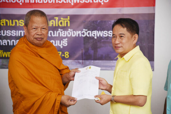 ที่บริเวณหน้าอาคารหอประชุมอาชาสีหมอก ศาลากลางจังหวัดสุพรรณบุรี พระครูพิพัฒน์สุวรรณาภรณ์ (หลวงพ่อวิชัย ใจดี) รองเจ้าคณะอำเภอศรีประจันต์ เจ้าอาวาสวัดหนองเพียร ต.บางงาม อ.ศรีประจันต์ จ.สุพรรณบุรี พร้อมด้วย นางบุญเอื้อ สอดสี นายก อบต.บางงาม นายนที คล้ายทอง กำนันตำบลบางงาม