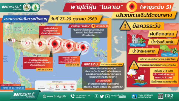 นายอภินันท์ เผือกผ่อง รองผู้ว่าราชการจังหวัดนครปฐม เปิดเผยว่า กรมอุตุนิยมวิทยาประกาศแจ้ง เรื่อง พายุไต้ฝุ่น โมลาเบ พายุระดับห้า บริเวณทะเลจีนใต้ตอนกลาง คาดว่าจะเคลื่อนขึ้นฝั่งบริเวณประเทศเวียดนามตอนกลาง ในวันนี้ (28 ต.ค.63) หลังจากนั้นจะอ่อนกำลังลงตามลำดับ ประกอบกับลมตะวันตกเฉียงใต้จะมีกำลังแรงขึ้น ส่งผลทำให้ภาคเหนือตอนกลาง ภาคตะวันออกเฉียงเหนือ ภาคตะวันออก ภาคกลาง และภาคใต้ มีฝนตกหนักกับมีลมแรง ขอให้ประชาชนบริเวณดังกล่าวระวังอันตรายจากฝนตกหนักและลมแรง