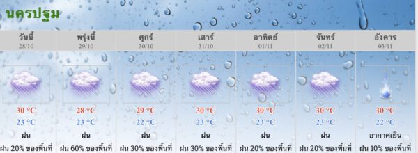 จากอิทธิพลดังกล่าว ทำให้จังหวัดนครปฐมอาจเกิดน้ำท่วมฉับพลัน น้ำล้นตลิ่ง ในช่วงระหว่างวันที่ 29-30 ตุลาคมนี้ จึงขอให้ประชาชนเตรียมความพร้อม และติดตามข้อมูลสภาวะอากาศ ข่าวสารจากทางราชการอย่างใกล้ชิด รวมถึงเฝ้าระวังสถานการณ์ฝนตกหนัก ปริมาณฝนตกสะสม โดยเฉพาะพื้นที่ลุ่มต่ำ และพื้นที่ริมแม่น้ำอาจจะได้รับผลกระทบจากน้ำท่วมขังและน้ำล้นตลิ่ง ตลอดจนระวังอันตรายจากฝนฟ้าคะนอง ลมกระโชกแรง ฟ้าผ่า หลีกเลี่ยงการอยู่ในที่โล่งแจ้ง ใต้ต้นไม้ใหญ่