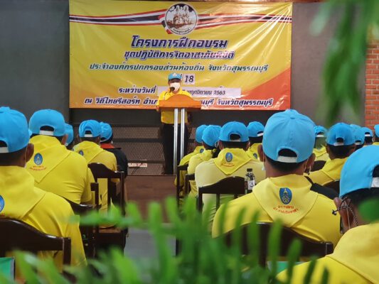 ซึ่งมีจิตอาสาจาก เทศบาลตำบลบ้านโข้ง อบต.ดอนคา อบต.พลับพลาไชย และอบต.หนองโอง อำเภออู่ทอง ตามที่กระทรวงมหาดไทย ได้กำหนดแนวทางการขับเคลื่อนการปฏิบัติงานของชุดปฏิบัติการจิตอาสาประจำองค์กรปกครองส่วนท้องถิ่น ให้แก่ อบต.และเทศบาล ทุกแห่ง โดยรับสมัครจิตอาสาภัยพิบัติอย่างน้อย 50 คน ต่อแห่ง ระยะเวลาการฝึกอบรมจำนวน 3 วัน ขอบเขตวิชาประกอบด้วย 15 วิชา 27 ชั่วโมง แบ่งเป็นการบรรยาย จำนวน 8 วิชา ระยะเวลา 12 ชั่วโมง และการฝึกปฏิบัติจำนวน 6 วิชา ระยะเวลา 15 ชั่วโมง และให้จัดทำแผนปฏิบัติการฝึกอบรมให้ครบทุกแห่ง