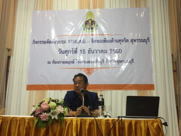 ด้าน นางวริดา ตันบุญเอก ผู้อำนวยการสำนักงานป้องกันและปราบปรามการทุจริต ประจำจังหวัดสุพรรณบุรี กล่าวเพิ่มเติมว่า จังหวัดสุพรรณบุรีได้รับคัดเลือกให้เป็น 1 ใน 27 จังหวัดนำร่องจัดโครงการ STRONG จิตพอเพียงต้านทุจริต ในปีงบประมาณ พ.ศ. 2561 โดยมีวัตถุประสงค์เพื่อสร้างเสริมให้บุคคลและชุมชนมีจิตพอเพียงต้านทุจริตด้วยโมเดล STRONG จนกระทั่งพัฒนาเป็นวัฒนธรรมต้านทุจริต ด้วยการประยุกต์และบูรณาการหลักปรัชญาเศรษฐกิจพอเพียงเข้ากับความโปร่งใส การแยกแยะผลประโยชน์ส่วนตัวและผลประโยชน์ส่วนรวม ตระหนักรู้และใฝ่รู้ปัญหาการทุจริต
