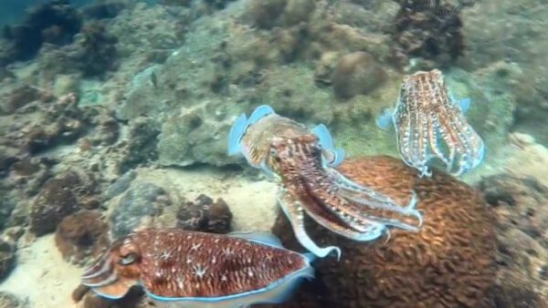 นักท่องเที่ยวหนีหนาวลงใต้ท่องทะเลตรัง ดำน้ำดูปะการังที่แสนสวยงามตามเกาะต่างๆ ในจ.ตรัง ไม่ผิดหวังทะเลสวย น้ำใส มองเห็นปลา ปะการังได้อย่างชัดเจน แต่ที่ทำให้นักท่องเที่ยวตื่นตาตื่นใจมากที่สุดก็เป็นเจ้าหมึกกระดองยักษ์ที่กำลังเกี่ยวพาราสี อวดโฉมให้นักท่องเที่ยวได้ชมกันอย่างใกล้ชิด