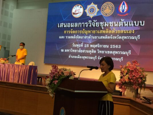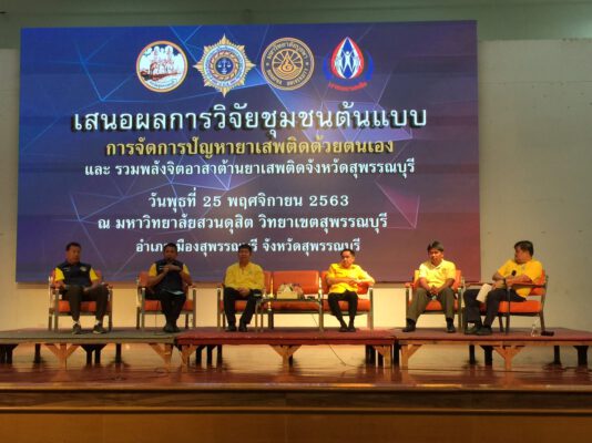 ซึ่งจังหวัดสุพรรณบุรี ได้ร่วมกับมหาวิทยาลัยบูรพา ดำเนินการศึกษาโครงการศึกษาชุมชนต้นแบบในการจัดการการป้องกันปัญหายาเสพติดด้วยตนเอง กรณีศึกษาชุมชต้นนแบบในจังหวัดสุพรรณบุรี โดยการสนับสนุนงบประมาณจากกองทุนป้องกันและแก้ไขปัญหายาเสพติด สำนักงาน ป.ป.ส. ซึ่งทีมคณะวิจัยได้ลงไปทำการศึกษาและรวบรวมข้อมูลในพื้นที่ ทั้งหมด 12 ชุมชน ในทั้ง 10 อำเภอ โดยมีวัตถุประสงค์เพื่อศึกษาวิจัยแนวทางการแก้ไขปัญหายาเสพติด ของชุมชนต้นแบบที่มีผลกาดำเนินการด้านการแก้ไขปัญหายาเสพติดที่มีประสิทธิภาพ จำนวน 12 ชุมชน จากทั้ง 10 อำเภอ และเพื่อศึกษาปัจจัยที่เป็นสาเหตุและอุปสรรค ต่อการแก้ไขปัญหายาเสพติดในพื้นที่กรณีศึกษาเฉพาะ จำนวน 1 ชุมชน ในพื้นที่อำเภอเมืองสุพรรณบุรี เพื่อได้นำข้อมูลและความรู้ที่ได้จากพื้นที่ดังกล่าว มาสร้างเป็นแนวทางต้นแบบในการบริหารจัดการของชุมชน ให้มีความเข้มแข็งต่อการแก้ไขปัญหายาเสพด้วยตนเอง เพื่อถ่ายทอดไปยังชุมชนอื่นๆ สำหรับนำไปปรับใช้ในพื้นที่ให้เกิดประโยชน์ต่อไป