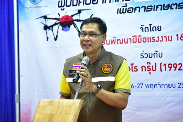 นายนพดล น้อยอุทัย รักษาราชการแทน ผู้อำนวยการสถาบันพัฒนาฝีมือแรงาน 16 นครปฐม กล่าวว่า การฝึกอบรมในครั้งนี้จัดเป็นครั้งที่ 2 เนื่องจากมีผู้สนใจจำนวนมาก เป็นหลักสูตร 18 ชั่วโมง ประกอบด้วย การฝึกภาคทฤษฎี ณ ห้องฝึกอบรมสถาบันพัฒนาฝีมือแรงงาน 16 นครปฐม และฝึกภาคปฏิบัติ ณ แปลงนาสาธิตการฝึก หมู่ที่ 5 ตำบลลำเหย อำเภอดอนตูม จังหวัดนครปฐม โดยมีผู้สมัครเข้าร่วมฝึกอบรม จำนวน 85 คน ได้รับการคัดเลือกเข้ารับการฝึกอบรม จำนวน 20 คน กิจกรรมการฝึกเน้นทักษะความรู้ในภารกิจภาคเกษตรกรรม เพื่อให้ผู้สำเร็จการฝึกอบรม เป็นผู้บังคับกาศยานไร้คนขับที่มีความรู้ ความสามารถ และมีทักษะ สามารถนำไปประกอบอาชีพภาคเกษตรกรรม และต่อยอดในอาชีพที่เกี่ยวข้อง ตลอดจนพัฒนาเทคโนโลยีการเกษตรกรในทฤษฎีที่ว่า “ทำน้อยได้มาก” อย่างยั่งยืน
