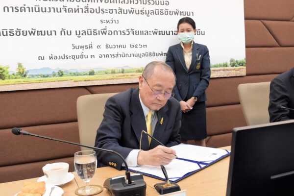 ✨วันที่ 9 ธันวาคม 2563 ดร.สุเมธ ตันติเวชกุล กรรมการและเลขาธิการมูลนิธิชัยพัฒนา และพลเอก ภุชพงศ์ พงษ์ศิริ ประธานกรรมการมูลนิธิเพื่อการวิจัยและพัฒนาอย่างยั่งยืน ร่วมลงนามในบันทึกข้อตกลงความร่วมมือระหว่างมูลนิธิชัยพัฒนา และมูลนิธิเพื่อการวิจัยและพัฒนาอย่างยั่งยืน ในการจัดทำสื่อประชาสัมพันธ์มูลนิธิชัยพัฒนา ณ ห้องประชุมชั้น 3 สำนักงานมูลนิธิชัยพัฒนา กรุงเทพฯ