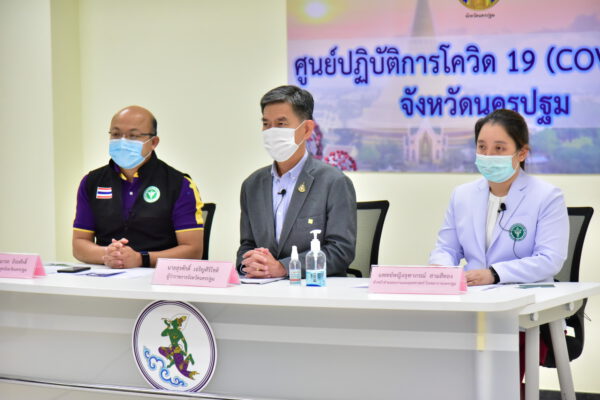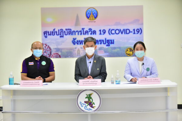 ค่ำวันนี้ (22 ธ.ค.63) นายสุรศักดิ์ เจริญศิริโชติ ผู้ว่าราชการจังหวัดนครปฐม พร้อมด้วยนายแพทย์สามารถ ถิระศักดิ์ นายแพทย์สาธารณสุขจังหวัดนครปฐม และแพทย์หญิงจุฑาภรณ์ สามแสงทอง หัวหน้าฝ่ายแผนงานและยุทธศาสตร์ โรงพยาบาลนครปฐมแถลง สถานการณ์โรคติดเชื้อไวรัสโคโรนา 2019 หรือ โควิด-19 ในพื้นที่จังหวัดนครปฐม ที่ห้องแถลงข่าว ศูนย์ปฏิบัติการโควิด-19 จังหวัดนครปฐม