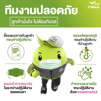 AIS Fibre เตรียมความพร้อมดูแลลูกค้าช่วงสถานการณ์ COVID-19 ระบาดรอบใหม่อย่างใกล้ชิด จัดเต็มทีมงานวิศวกรและงานบริการ พร้อมรองรับการใช้งานของลูกค้าคนไทยที่เพิ่มสูงขึ้นในช่วง Work From Home หรือ Learn From Home ให้สามารถใช้งานอินเทอร์เน็ตได้อย่างเต็มประสิทธิภาพและต่อเนื่องทั่วไทย เน้นย้ำ!ทีมช่างติดตั้งอินเทอร์เน็ต ดูแลสุขอนามัยตามนโยบายภาครัฐอย่างเคร่งครัดทั้งก่อนและระหว่างเข้าปฏิบัติงานในที่พักของลูกค้า ด้วยมาตรฐานการให้บริการอย่างมืออาชีพ เสริมสร้างความเชื่อมั่นให้ลูกค้าได้รับบริการอย่างอุ่นใจเต็มที่