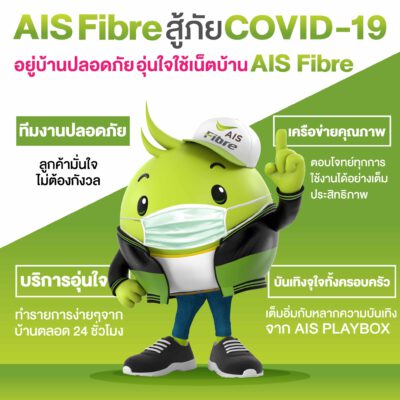 ในฐานะผู้ให้บริการอินเทอร์เน็ตบ้าน AIS Fibre ได้เตรียมแผนรองรับอย่างรอบด้านเพื่อให้ลูกค้าสามารถ ใช้งานเน็ตบ้านรองรับความต้องการในช่วงนี้ได้อย่างต่อเนื่องและเต็มประสิทธิภาพพร้อมเสริมทัพทีมวิศวกรและทีมบริการ สแตนบายดูแลประสิทธิภาพเครือข่ายทั่วประเทศเข้มข้นตลอด 24 ชั่วโมง ในทุกพื้นที่ ทั่วประเทศ ตลอดจนช่องทางติดต่อที่หลากหลาย ดูแลแก้ปัญหาตลอด 24 ชั่วโมงทั้ง Call Center 1175, Online Agents และ Ask Aunjai รวมทั้งช่องทางที่ให้ลูกค้าทำรายการด้วยตัวเองง่ายๆผ่าน myAIS app หรือAIS Fibre LINE Connect”