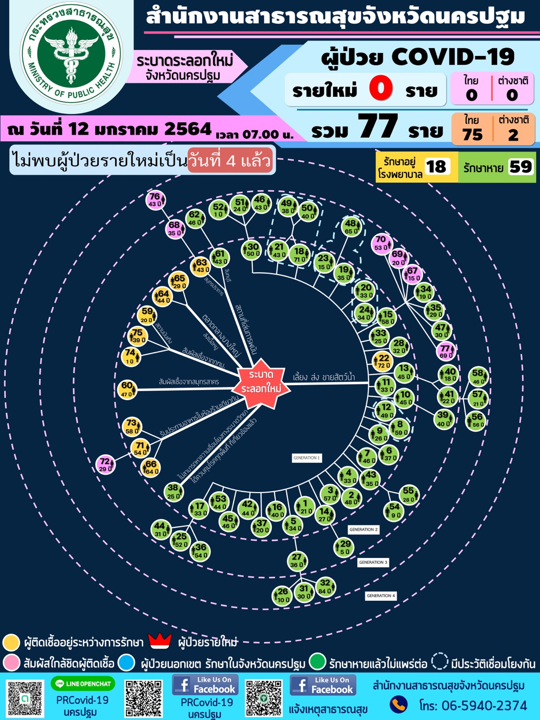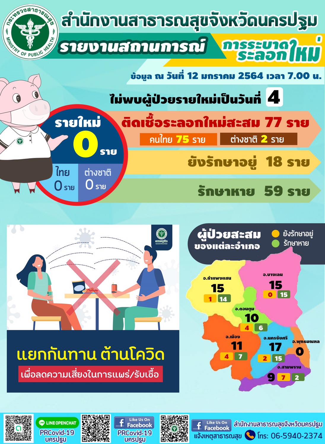 การประชุมคณะกรรมการโรคติดต่อจังหวัดนครปฐม วันนี้ (12 ม.ค.64) มี นายสุรศักดิ์ เจริญศิริโชติ ผู้ว่าราชการจังหวัดนครปฐม เป็นประธาน ที่ประชุมรับทราบสถานการณ์การติดเชื้อไวรัสโคโรนา 2019 ในพื้นที่จังหวัดนครปฐม ซึ่งตั้งแต่วันที่ 9 มกราคม 2564 ถึงวันนี้ไม่พบผู้ติดเชื้อรายใหม่ติดต่อกันเป็นเวลา 4 วัน ซึ่งผู้ว่าราชการจังหวัดนครปฐมได้เน้นย้ำ ขอความร่วมมือประชาชนการ์ดอย่าตก และปฏิบัติตามมาตรการของจังหวัดนครปฐมอย่างเคร่งครัด เพื่อให้การระบาดของเชื้อโควิด-19 ลดลงอย่างต่อเนื่อง