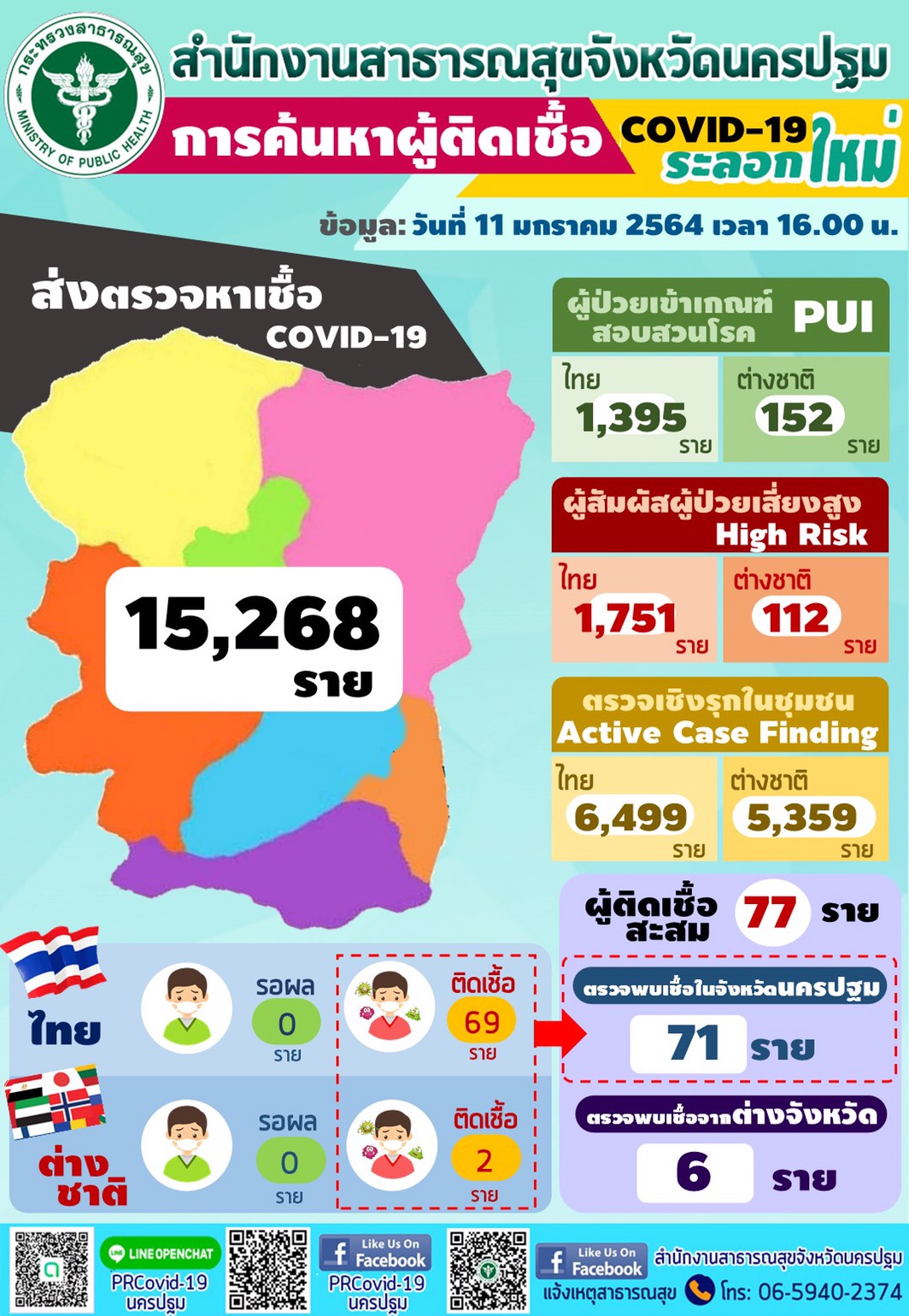 สำหรับผู้ป่วยยืนยันของจังหวัดนครปฐมขณะนี้มีจำนวน 77 ราย รักษาหายตรวจไม่พบเชื้อและกลับบ้านแล้ว 55 ราย รักษาอยู่ที่โรงพยาบาล 22 ราย ในส่วนของการตรวจเชิงรุกกลุ่มผู้สัมผัส/กลุ่มเสี่ยง ตั้งแต่วันที่ 19 ธันวาคม 2553 ถึงวันที่ 11 มกราคม 2564 ตรวจแล้ว 14,920 ราย เป็นคนไทย 9,388 ราย ต่างชาติ 5,542 ราย ซึ่งทางจังหวัดได้เร่งดำเนินการตรวจเชิงรุกในทุกพื้นที่ โดยในสัปดาห์นี้ สำนักงานสาธารณสุขจังหวัดฯ ได้ลงพื้นที่ค้นหาโควิด-19 เชิงรุก ร่วมกับคณะเทคนิคการแพทย์ มหาวิทยาลัยมหิดล