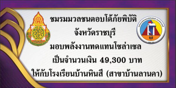 วันที่15 มกราคม 2564 เวลา 10.30 น ชมรมมวลชนตอบโต้ภัยพิบัติจังหวัดราชบุรี พร้อมเจ้าหน้าที่ มอบชุดอุปกรณ์ โซล่าเซลล์ในการดูดน้ำบาดาล ให้กับโรงเรียนบ้านหินสี (สาขาบ้านลานคา) เป็นจำนวน 1 ชุด ราคา 49,300 บาท โดยมี นางสาวรุ่งทิวา ดวงกล้า ผู้อำนวยการโรงเรียน คณะครู และผู้ใหญ่แดง มาลา ผู้ใหญ่บ้านหมู่8บ้านลานคา พร้อมผู้ช่วยผู้ใหญ่บ้าน เป็นผู้รับมอบ สืบเนื่องมาจากการจัดงานปั่นจักรยานการกุศล (โครงการปั่นด้วยใจไปด้วยกันครั้งที่ 1) เพื่อสร้างโซล่าเซลล์ พลังงานแสงอาทิตย์ในการดูดน้ำบาดาล ภายในโรงเรียน เพื่อลดค่าใช้จ่ายในการใช้กระแสไฟฟ้า ภายในโรงเรียนบ้านหินสี (สาขาบ้านลานคา)