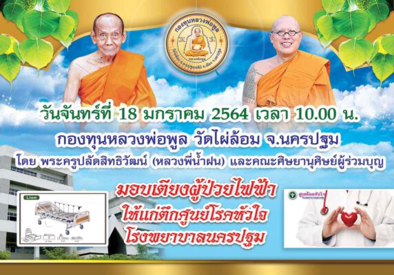 ซึ่งพระครูปลัดสิทธิวัฒน์ หลวงพี่น้ำฝน เจ้าอาวาสวัดไผ่ล้อม ได้กล่าวว่า การมอบเตียงไฟฟ้าสำหรับผู้ป่วย จำนวน 25 เตียง ในครั้งนี้ ทางกองทุนหลวงพ่อพูล วัดไผ่ล้อม โดยหลวงพี่น้ำฝน ร่วมกับคณะศิษยานุศิษย์ หลายท่านได้พร้อมใจกันบริจาคทรัพย์ เพื่อร่วมสร้างกุศลใหญ่ ให้โรงพยาบาล เพื่อให้ผู้ป่วยที่รักษาตัวในศูนย์โรคหัวใจ โรงพยาบาลนครปฐมแห่งนี้ ได้ใช้ประโยชน์ ซึ่งกองทุนหลวงพ่อพูล วัดไผ่ล้อม ที่มี หลวงพี่น้ำฝน เป็นประธานนี้ พร้อมที่จะเดินหน้าช่วยเหลือสาธารณะสงเคราะห์ เพื่อสังคมให้เกิดประโยชน์กับประชาชนให้มากที่สุด รวมทั้งได้มีการจัดมอบเตียงไฟฟ้าสำหรับผู้ป่วยให้กับโรงพยาบาลนครปฐม มาอย่างต่อเนื่อง และที่ผ่านมาได้มอบเตียงไฟฟ้าสำหรับผู้ป่วย ไปแล้วจำนวนเกือบ 200เตียง นำไปใช้ ที่ อาคาร 100 ปี สาธารณสุขโรงพยาบาลนครปฐมไปแล้วก่อนหน้านี้ และในวันนี้ได้มีการมอบเตียงไฟฟ้าสำหรับผู้ป่วย ซึ่งเป็นเตียงที่ได้มาตรฐาน การรับรองจาก CE. UL เป็นมาตรฐานสากล เทียบเท่ากับที่ใช้ในห้องพิเศษในโรงพยาบาลเอกชน ทำให้เป็นการยกระดับทางการดูแลและฟักฟื้นของผู้ป่วยให้เกิดความสะดวก สบายทั้งผู้ป่วย ญาติ และทีมแพทย์ พยาบาล ผู้ทำการรักษา