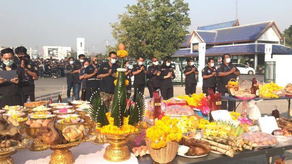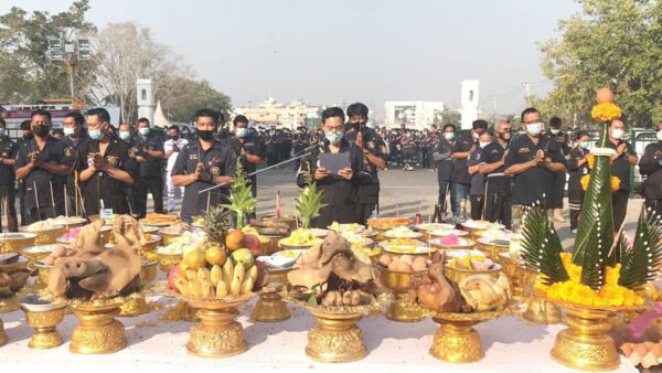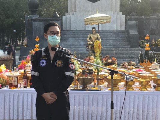 โดยมีการรักษาระยะห่างและตรวจวัดไข้ ก่อนเข้าร่วมพิธี ทั้งนี้อาสาสมัครแต่ละอำเภอ ได้นำเครื่องมืออุปกรณ์ต่างๆที่ใช้ในช่วยเหลือผู้ประสบเหตุ เข้าร่วมพิธีอันศักดิ์สิทธิ์นี้ด้วย