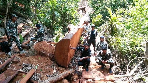โดยคณะเจ้าหน้าที่ตรวจพบร่องรอยการชักลากไม้ลงมาจากภูเขาสูงตามที่ได้รับแจ้ง จึงเดินเท้าตามรอยไปกลางป่าเป็นรอยชักลากไปในพื้นที่ป่าไม้สมบูรณ์ ประมาณ 2 ชม.ตรวจพบจุดลักลอบตัดไม้ ลักลอบแปรรูปไม้ ดังนี้