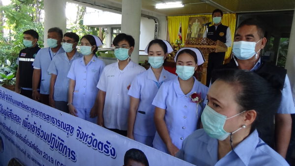 ส่วนทางด้านนายแพทย์บรรเจิด สุขพิพัฒปานนท์ นายแพทย์สาธารณสุขจังหวัดตรัง ได้กล่าวว่า ตอนนี้โรคโควิด 19 กำลังระบาดที่บ้านเราตอนนี้ในภาพรวมของประเทศอยู่ที่จังหวัดสมุทรสาครเป็นหลัก จังหวัดอื่น ๆ เริ่มลดลง ด้วยความที่จังหวัดสมุทรสาครเรามีพี่น้องแรงงานต่างด้าวมากก็ทำให้ทุกจังหวัดส่งทีมไปช่วยเพื่อจัดการ Swab ในกลุ่มพี่น้องแรงงานต่างด้าวทุกคน ซึ่งวันนี้เป็นคิวของจังหวัดตรังก็ได้รับเกียรติจากผู้ว่าราชการจังหวัดมาปล่อยแถวเพื่อไปปฏิบัติหน้าที่ที่จังหวัดสมุทรสาคร ทีมนี้ไปวันที่ 30 มกราคม-7 กุมภาพันธ์ ตอนนี้จังหวัดตรังคงที่แล้ว กลุ่มผู้สัมผัสกับ 5 รายเหล่านั้นเป็นผล Negative ทั้งสิ้น เพราะฉะนั้นถือว่าจังหวัดตรังสงบ