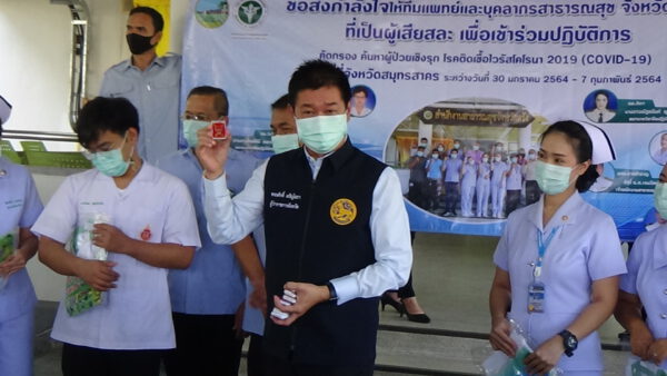 ที่สำนักงานสาธารณสุขจังหวัดตรัง อ.เมืองตรัง นายขจรศักดิ์ เจริญโสภา ผู้ว่าราชการจังหวัดตรัง เป็นประธานในพิธีส่งและให้กำลังใจทีมเฝ้าระวังเชิงรุกจังหวัดตรังไปปฏิบัติหน้าที่ที่จังหวัดสมุทรสาคร ณ สำนักงานสาธารณสุขจังหวัดตรัง อ.เมืองตรัง ตามที่เกิดการแพร่ระบาดของโรคติดเชื้อไวรัสโคโรนา 2019 (COVID-19) ในประเทศไทย โดยเฉพาะในพื้นที่เขตสุขภาพที่ 5 คือ จังหวัดสมุทรสาคร หลังพบการแพร่ระบาดโควิด-19 รอบใหม่ ขยายวงกว้างเพิ่มขึ้นในเวลาอันรวดเร็ว โดยเฉพาะกลุ่มแรงงานต่างด้าว ทำให้บุคลากรในการตรวจคัดกรองเฝ้าระวังเชิงรุกไม่เพียงพอต่อการปฏิบัติหน้าที่ ดังนั้นสำนักงานสาธารณสุขจังหวัดตรังได้จัดส่งทีมเฝ้าระวังเชิงรุกไปปฏิบัติงาน จำนวน 8 คน ระหว่างวันที่ 30 มกราคม – 7 กุมภาพันธ์ 2564 ประกอบด้วย แพทย์ พยาบาล เจ้าหน้าที่สาธารณสุข และสหวิชาชีพ ทั้งนี้ ผู้ว่าราชการจังหวัดตรัง ได้กล่าวว่า วันนี้จังหวัดตรังได้ส่งบุคลากรทางการแพทย์ และพยาบาลไปช่วยปฏิบัติการค้นหาเชิงรุกในพื้นที่จังหวัดสมุทรสาคร ซึ่งจังหวัดตรังได้ส่งบุคลากรไป 8 ท่าน ทั้ง 8 คนมีกำลังใจที่ดีและมีความตั้งใจที่จะไปช่วยเหลือพี่น้องชาวจังหวัดสมุทรสาคร วันนี้ก็มีทีมบุคลากรของสาธารณสุขจังหวัดตรังได้มาร่วมส่งทีมที่จะไปจังหวัดสมุทรสาครก็ต้องเรียนว่าทั้ง 8 คนเต็มใจและมีองค์ความรู้ที่จะไปช่วยในระยะเวลาที่กำหนดจนถึงวันที่ 7 กุมภาพันธ์ วันนี้ผมก็ได้มาให้กำลังใจน้อง ๆ ทั้ง 8 คนและอวยพรให้น้อง ๆ ซึ่งเขาเป็นวีรบุรุษชุดขาวของจังหวัดตรัง เราให้ครุฑซึ่งเป็นเครื่องรางแสดงถึงพลังอำนาจ แสดงถึงการที่มีบารมีในเรื่องของการที่ไปทำงานแล้วกลับมาด้วยความปลอดภัย ซึ่งคิดว่าเป็นการสร้างขวัญและกำลังใจให้บุคลากรทั้ง 8 คน แต่อย่างไรก็ตามในการไปปฏิบัติครั้งนี้ก็ขอขอบคุณในน้ำใจไมตรีที่แบ่งปันช่วยเหลือ และแสดงออกถึงความมีน้ำใจ ความเสียสละ ในยามที่เกิดวิกฤติการแพร่ระบาดของโรคโควิด-19 อีกทั้งได้เน้นย้ำให้ทุกคนปฏิบัติหน้าที่อย่างเต็มกำลังความสามารถพร้อมทั้งดูแลตนเองให้ปลอดภัยจากโรคโควิด-19