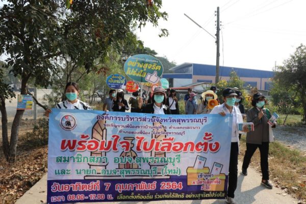 องค์การบริหารส่วนจังหวัดสุพรรณบุรี นำโดยนางพัฒนี จตุรพร หัวหน้าสำนักปลัด องค์การบริหารส่วนจังหวัดสุพรรณบุรี พร้อมด้วยหัวหน้าส่วนราชการ ข้าราชการ และพนักงานองค์การบริหารส่วนจังหวัดสุพรรณบุรี ได้ลงพื้นที่เดินประชาประชาสัมพันธ์การออกเสียงเลือกตั้งสมาชิกสภาองค์การบริหารส่วนจังหวัดสุพรรณบุรีและนายกองค์การบริหารส่วนจังหวัดสุพรรณบุรี ใหม่ ในหน่วยเลือกตั้งที่ 6 ตำบลดอนมะนาว เขตเลือกตั้งที่ 1 อำเภอสองพี่น้อง จังหวัดสุพรรณบุรี เมื่อวันที่ 4 กุมภาพันธ์ 2564 เพื่อกระตุ้นให้ประชาชนในพื้นที่เห็นความสำคัญและออกมาลงคะแนนเลือกตั้งสมาชิกสภาองค์การบริหารส่วนจังหวัดสุพรรณบุรีและนายกองค์การบริหารส่วนจังหวัดสุพรรณบุรี ใหม่ ในวันอาทิตย์ที่ 7 กุมภาพันธ์ 2564 ตั้งแต่เวลา 08.00 – 17.00 น.
