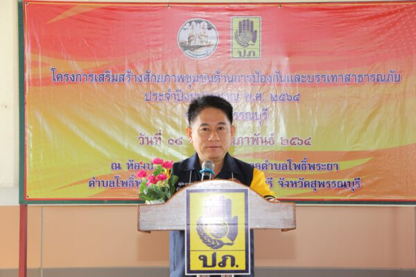 นายณัฐภัทร สุวรรณประทีป ผู้ว่าราชการจังหวัดสุพรรณบุรี เป็นประธานเปิดการอบรมตามโครงการเสริมสร้างศักยภาพชุมชนด้านการป้องกันและบรรเทาสาธารณภัยที่ห้องประชุมสำนักงานเทศบาลตำบลโพธิ์พระยา อำเภอเมืองสุพรรณบุรี