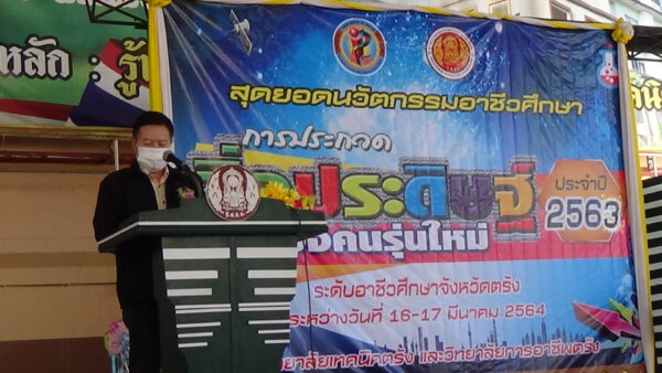 ที่ลานโดมอเนกประสงค์ วิทยาลัยเทคนิคตรัง จังหวัดตรัง นายไพบูลย์ โอมาก รองผู้ว่าราชการจังหวัดตรัง เป็นประธานเปิดงานสุดยอดนวัตกรรมอาชีวศึกษาการประกวดสิ่งประดิษฐ์ของคนรุ่นใหม่ระดับอาชีวศึกษาจังหวัดตรัง ประจำปีการศึกษา 2563 ซึ่งกำหนดจัดขึ้นในระหว่างวันที่ 16 – 17 มีนาคม 2564 สำหรับการประกวดสิ่งประดิษฐ์ของคนรุ่นใหม่ในครั้งนี้มีอนุกรรมการฝ่ายแผนงานและความร่วมมืออาชีวศึกษาจังหวัดตรัง เป็นผู้รับผิดชอบโครงการโดยมีวัตถุประสงค์ดังนี้ เพื่อส่งเสริม สนับสนุน และเสริมสร้างเยาวชนอาชีวศึกษา ให้เป็นนักคิด นักประดิษฐ์คิดค้นสร้างสรรค์ผลงานด้านวิทยาศาสตร์และเทคโนโลยีใหม่ใหม่ขึ้น และเพื่อพัฒนาความรู้ทักษะวิชาชีพของนักเรียนนักศึกษา ให้เข้าสู่ความเป็นมาตรฐานและพัฒนาตนเองให้ทันต่อการเปลี่ยนแปลงทางเทคโนโลยีของโลกยุคปัจจุบัน ตลอดจนเพื่อคัดเลือกผลงานสิ่งประดิษฐ์ของคนรุ่นใหม่เป็นตัวแทนสถานศึกษาอาชีวศึกษาจังหวัดตรัง เพื่อเข้าร่วมการประกวดสิ่งประดิษฐ์ของคนรุ่นใหม่ในระดับภาคใต้ต่อไป