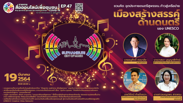 อาจารย์กิติ จารุอารยนันท์ ประธานสถาบันพัฒนาธุรกิจภูมิภาค เปิดเผยว่า สถาบันพัฒนาธุรกิจภูมิภาค โดยมูลนิธิองค์กรเครือข่ายบริการธุรกิจภูมิภาคได้ออกแบบ และจัดทำรายการสื่อออนไลน์เพื่อชุมชนขึ้น ทุกวันศุกร์ เวลา 18.30 – 20.00 น. เพื่อให้ประชาชนทุกภาคส่วนได้รับรู้ข่าวสาร และแนวทางในการรับมือ แก้ปัญหา เพื่อการดำรงชีวิตอย่างมีความสุข และยั่งยืน โดยในวันที่ 19 มีนาคม 2564 ในประเด็น “ชวนคิด จุดประกายดนตรีสุพรรณ ก้าวสู่เครือข่ายเมืองสร้างสรรค์ด้านดนตรีของ UNESCO” ในหัวข้อสนทนา เที่ยวงานเนื่องในวันอนุรักษ์มรดกไทย “ฟังลูกทุ่ง นุ่งผ้าลาย สไตล์สุพรรณ” สนุกกับการแสดงดนตรีเยาวชนและศิลปิน ศิลปะ งานสตรีทอาร์ต การแสดงดนตรีบำบัด การแสดงวงดนตรีไทย การแสดงวงดนตรีสตริง การแสดงวงเพื่อชีวิต และมหกรรมอาหารอร่อยของดีสุพรรณ /เล่าเรื่องจุดเริ่มต้นเสียงดนตรีเมืองสุพรรณ จากบทประพันธ์วรรณคดีเรื่องขุนช้าง-ขุนแผน“ขุนช้าง-ขุนแผน” ที่ก่อให้เกิดวัฒนธรรมการขับเสภา และต่อยอดไปสู่การ “บรรเลงปี่พาทย์“ /มารู้จัก และต่อยอด เพิ่มค่า หาจุดต่าง “เบญจภาคีดนตรีสุพรรณ” ที่มีตั้งแต่ศิลปินแห่งชาติเพลงไทยเดิม พ่อเพลง-แม่เพลงพื้นบ้าน ราชา-ราชินีเพลงลูกทุ่ง ศิลปินเพลงเพื่อชีวิต ไปจนถึงศิลปินเพลงสมัยใหม่ทั้งป๊อปร็อคไปจนถึงเพลงแร๊ป – แชร์ไอเดียกลไกพัฒนาการเป็นเจ้าบ้านที่ดี และร่วมกันขับเคลื่อนเมืองสุพรรณบุรีสู่ความเป็นเมืองสร้างสรรค์ด้านดนตรีของยูเนสโก (UNESCO Creative Cities Network)