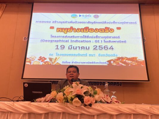 ที่โรงแรมธรรมรินทร์ธนา อ.เมืองตรัง นายภูวนัฐ สมใจ รองผู้ว่าราชการจังหวัดตรัง เป็นประธานในพิธีเปิดกิจกรรมอบรมเตรียมความพร้อมการขออนุญาตใช้ตราสัญลักษณ์สิ่งบ่งชี้ทางภูมิศาสตร์หมูย่างเมืองตรัง ตามโครงากรส่งเสริมการใช้สิ่งบ่งชี้ทางภูมิศาสตร์ (Geographical Indication : GI) นางสาวสุภากิตติ์ เกลี้ยงสงค์ หัวหน้าสำนักงานพาณิชย์จังหวัดตรัง กล่าวว่า จังหวัดตรังมีจุดเด่นเรื่องอาหารเป็นเอกลักษณ์ หนึ่งในอาหารเด่นของจังหวัดตรัง คือ หมูย่างเมืองตรัง จึงได้รับการขนานนามว่า “ตรัง…ยุทธจักรความอร่อย” แต่เนื่องจากสภาพการค้าขายในปัจจุบันมีการแข่งขันทางการค้าสูงมาก สินค้าที่สามารถจำหน่ายได้จะต้องมีเอกลักษณ์ที่โดดเด่นเพื่อจูงใจลูกค้าให้ตัดสินใจซื้อสินค้า นอกจากนี้ หากมีการรับรองจากหน่วยงานต่าง ๆ ก็จะช่วยสร้างความมั่นใจในสินค้ามากขึ้น ดังนั้น สิ่งบ่งชี้ทางภูมิศาสตร์ ถือเป็นเครื่องหมายรับรองชนิดหนึ่งที่ช่วยสร้างความมั่นใจให้แก่ผู้บริโภคว่าจะได้รับสินค้าดี มีคุณภาพสามารถอ้างอิงแหล่งผลิตและตรวจสอบย้อนกลับได้ สินค้าหมูย่างเมืองตัง กรมทรัพย์สินทางปัญญา กระทรวงพาณิชย์ได้ประกาศขึ้นทะเบียนสิ่งบ่งชี้ภูมิศาสตร์ ตั้งแต่วันที่ 27 มิถุนายน 2548 มีผู้ประกอบการที่รับอนุญาตให้ใช้ตราสัญลักษณ์สิ่งบ่งชี้ทางภูมิศาสตร์ไทย GI หมู่ย่างเมืองตรัง จำนวน 11 ราย