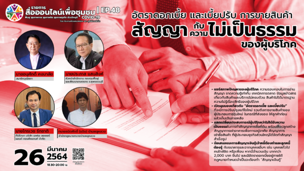 อาจารย์กิติ จารุอารยนันท์ ประธานสถาบันพัฒนาธุรกิจภูมิภาค เปิดเผยว่าสถาบันพัฒนาธุรกิจภูมิภาค โดย มูลนิธิองค์กรเครือข่ายบริการธุรกิจภูมิภาค ได้ออกแบบ และจัดทำรายการสื่อออนไลน์เพื่อชุมชนขึ้น ทุกวันศุกร์ เวลา 18.30 – 20.00 น. เพื่อให้ประชาชนทุกภาคส่วนได้รับรู้ข่าวสาร และแนวทางในการรับมือ แก้ปัญหา เพื่อการดำรงชีวิตอย่างมีความสุข และยั่งยืน โดยในวันที่ 26 มีนาคม 2564 ในประเด็น “อัตราดอกเบี้ย และเบี้ยปรับ การขายสินค้า สัญญากับความไม่เป็นธรรมของผู้บริโภค” ซึ่งมีหัวข้อสนทนา เรื่องสภาพปัญหาของผู้บริโภค ความรอบคอบในการอ่านสัญญา ขาดความรู้เท่าทันเทคนิคการตลาด ข้อมูลข่าวสารเกี่ยวกับสินค้าและบริการไม่ครบถ้วน สินค้าไม่ได้มาตรฐาน ความไม่รู้เรื่องสิทธิของผู้บริโภค