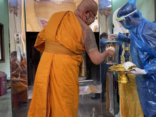 ในพิธีดังกล่าว พระครูปลัดสิทธิวัฒน์ เจ้าอาวาสวัดไผ่ล้อมได้นำคณะสงฆ์ เข้าร่วมสังเกตการณ์พร้อมทั้งเป็นประธานในพิธีฌาปนกิจด้วยความเรียบง่าย ในการจัดพิธีด้วยการสวมหน้ากากป้องกัน และนำโลงศพบรรจุเข้าเตาเผาทันทีเมื่อเดินทางมาถึง ซึ่งทางเจ้าหน้าที่ประจำเมรุของวัดไผ่ล้อม มีความเข้าใจในกระบวนการเนื่องจากเคยมีประสบการณ์ในการจัดการเรื่องดังกล่าวมาแล้ว