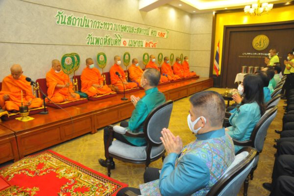 วันที่ 1เมษายน 2564เวลาประมาณ 07.30 น.นายเฉลิมชัย ศรีอ่อน รัฐมนตรีว่าการกระทรวงเกษตรและสหกรณ์ เป็นประธานวันคล้ายวันสถาปนากระทรวงเกษตรและสหกรณ์ เนื่องในโอกาสครบรอบ 129 ปี พร้อมด้วยร้อยเอก ธรรมนัส พรหมเผ่า รัฐมนตรีช่วยว่าการกระทรวงเกษตรและสหกรณ์ นางสาวมนัญญา ไทยเศรษฐ์ รัฐมนตรีช่วยว่าการกระทรวงเกษตรและสหกรณ์ นายประภัตร โพธสุธน รัฐมนตรีช่วยว่าการกระทรวงเกษตรและสหกรณ์ นายอลงกรณ์ พลบุตร ที่ปรึกษารัฐมนตรี นายนราพัฒน์ แก้วทอง ผู้ช่วยรัฐมนตรีดร.ทองเปลว กองจันทร์ ปลัดกระทรวงเกษตรและสหกรณ์ และผู้บริหาร ข้าราชการ และเจ้าหน้าที่ร่วมในพิธี ณ กระทรวงเกษตรและสหกรณ์ ประธานได้จุดธูปเทียนและถวายพวงมาลัย เพื่อสักการะสิ่งศักดิ์สิทธิ์ประจำกระทรวงเกษตรและสหกรณ์ ได้แก่ ศาลพระภูมิเจ้าที่ ศาลท้าวเวสสุวรรณ ศาลตา-ยาย องค์พระพิรุณทรงนาค (หน้าอาคาร) และองค์พระพิรุณทรงนาค (ห้องพิพิธภัณฑ์) จากนั้นเข้าสู่ช่วงพิธีสงฆ์ โดยประธานได้จุดธูปเทียนบูชาพระรัตนตรัย ถวายภัตตาหาร และจตุปัจจัยไทยธรรมแด่พระสงฆ์ ประธานสงฆ์ประพรมน้ำพุทธมนต์ให้กับผู้เข้าร่วมพิธี จากนั้นในเวลา 09.00 น.รัฐมนตรีว่าการกระทรวงเกษตรและสหกรณ์ เป็นประธานพิธีเปิดนิทรรศการผลงานของกระทรวงเกษตรและสหกรณ์ ณ ห้องประชุม 115