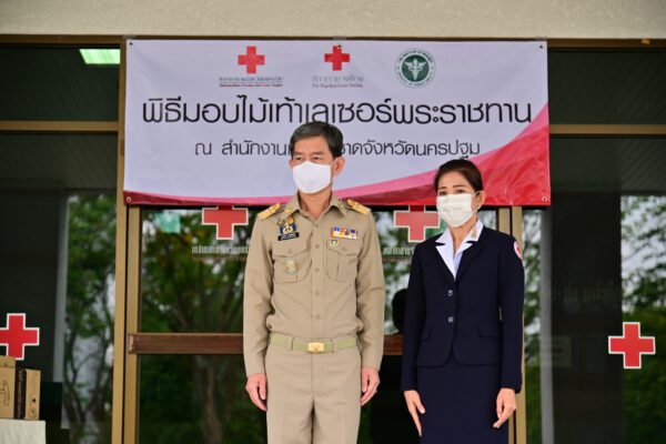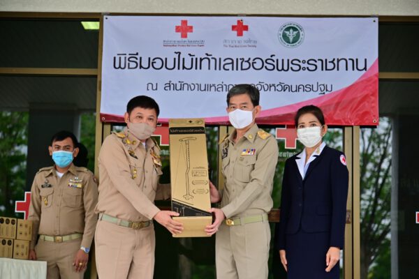 วันที่ 8 เมษายน 2564 ที่บริเวณลานหน้าสำนักงานเหล่ากาชาดจังหวัดนครปฐม นายสุรศักดิ์ เจริญศิริโชติ ผู้ว่าราชการจังหวัดนครปฐม พร้อมด้วย นางวราภรณ์ เจริญศิริโชติ นายกเหล่ากาชาดจังหวัดนครปฐม เป็นประธานมอบไม้เท้าเลเซอร์พระราชทาน เพื่อมอบให้ผู้ป่วยพาร์กินสันในจังหวัดนครปฐม โดยสำนักงานบริหารกิจการเหล่ากาชาด และศูนย์ความเป็นเลิศทางการแพทย์โรคพาร์กินสัน และกลุ่มโรคความเคลื่อนไหวผิดปกติ โรงพยาบาลจุฬาลงกรณ์ สภากาชาดไทย ได้ส่งไม้เท้าเลเซอร์พระราชทานให้แก่เหล่ากาชาดจังหวัด เพื่อส่งมอบให้แก่ผู้ป่วยพาร์กินสันทั่วประเทศ จำนวน 2,096 อัน ซึ่งจังหวัดนครปฐม ได้รับมอบไม้เท้าเลเซอร์ จำนวน 14 อัน เพื่อมอบให้ผู้ป่วยโรคพาร์กินสัน ใน 4 อำเภอ ได้แก่ อำเภอนครชัยศรี จำนวน 10 อัน อำเภอกำแพงแสน จำนวน 2 อัน อำเภอสามพรานและอำเภอบางเลน อำเภอละ 1 อัน
