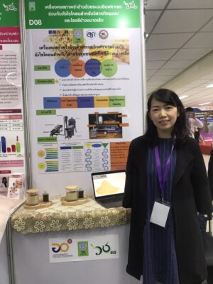 ซึ่งเครื่องต้นแบบจะช่วยยืดอายุหรือคงสภาพรำข้าวเพื่อแก้ปัญหาการเสื่อมคุณภาพของรำข้าวภายหลังกระบวนการขัดสีได้เร็วและมีประสิทธิภาพที่สุด โดยการใช้เทคนิคการให้ความร้อนแบบอินฟราเรดร่วมกับระบบถังไซโคลนแบบต่อเนื่อง โดยเริ่มจากการทดสอบสภาวะที่เหมาะสมในการคงสภาพรำข้าวด้วยเครื่องให้ความร้อนแบบอินฟราเรดขนาดจำลองในห้องปฏิบัติการที่เป็นระบบการผลิตแบบกะ เพื่อนำผลการศึกษาที่ได้มาเป็นแนวทางพัฒนาเครื่องคงสภาพรำข้าวต้นแบบที่มีกำลังการผลิตอย่างน้อย 100 กิโลกรัม ต่อวัน จากการทดลองพบว่าสภาวะการคงสภาพรำข้าวที่กำลังวัตต์สูงสุด 9000 วัตต์และระยะเวลานานที่สุด 4.21 นาที (ความเร็วรอบเท่ากับ 10 Hz) ทำให้ค่า FFA ของรำข้าวลดลงต่ำที่สุดเท่ากับ 1.97% และ 3.67% ที่อายุการเก็บ 4 สัปดาห์ ที่อุณหภูมิการเก็บ 30 และ 40 องศาเซลเซียส ตามลำดับ และอยู่ในระดับต่ำกว่าเกณฑ์ที่แนะนำ (ร้อยละ 5) และพบว่าที่สภาวะดังกล่าวไม่ส่งผลกระทบต่อปริมาณสารสำคัญต่าง ๆ ในรำข้าว โดยที่ค่าความชื้นและค่าวอร์เตอร์แอคติวิตี้มีค่าต่ำกว่า 0.6 ซึ่งส่งผลให้ปริมาณเชื้อจุลินทรีย์ในตัวอย่างมีค่าอยู่ภายใต้เกณฑ์มาตรฐาน CODEX ซึ่งใน อนาคต เครื่องดังกล่าวจะนำไปทดลองใช้ในพื้นที่เขตภาคเหนือตอนล่าง อาทิ จังหวัดกำแพงเพชร เป็นต้น