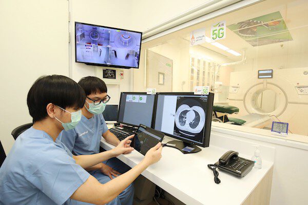 ● 5G AI อัจฉริยะ เดินหน้าร่วมมือกับราชวิทยาลัย จุฬาภรณ์ และโรงพยาบาลเครือข่าย คือ โรงพยาบาลน่าน โรงพยาบาลร้อยเอ็ด และ โรงพยาบาลเพชรบูรณ์ โดยการนำ AI CT Scan ปอด เข้ามาให้บริการอย่างต่อเนื่อง โดยจะช่วยวิเคราะห์รูปภาพทางการแพทย์เชิงปริมาณจากการตรวจวินิจฉัยทางเอกซเรย์คอมพิวเตอร์ (CT) ปอดของผู้ป่วย เพื่อวิเคราะห์ผู้ติดเชื้อ COVID-19 โดยการประยุกต์ใช้เทคโนโลยีและโซลูชันปัญญาประดิษฐ์ (Artificial Intelligence) กับแพลตฟอร์มที่ได้รับการเทรนจากข้อมูลของผู้ป่วยจริงในประเทศจีน ซึ่งเป็นการประมวลผลและวิเคราะห์ข้อมูลอย่างแม่นยำ รวดเร็ว และ สามารถวิเคราะห์ผลได้ภายในเวลาเพียง 25 วินาทีต่อ 1 เคส ความแม่นยำสูงสุดในการวินิจฉัยสูงถึง 96% นับว่ามีประสิทธิภาพอย่างยิ่ง โดยนวัตกรรมนี้จะช่วยให้บุคลากรทางการแพทย์ได้รับความปลอดภัย ลดปริมาณการตรวจสารคัดหลั่ง ลดจำนวนชุดตรวจ COVID-19 ช่วยลดการใช้ PPE และแบ่งเบาภาระให้แก่บุคลากรทางการแพทย์และช่วยให้บุคลากรหลายๆ ท่านสามารถกระจายตัวไปดูแลเคสผู้ป่วยได้อย่างทั่วถึงมากขึ้น ที่สำคัญ เป็นการสร้างความเท่าเทียมในการได้รับโอกาสทางสาธารณสุข ผ่าน 5G ได้อย่างชัดเจน