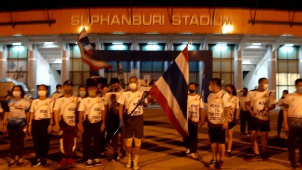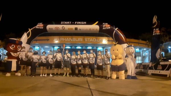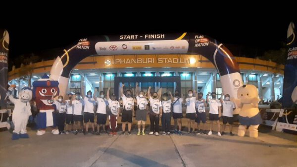 โดยตลอดเส้นทางมีอาสาสมัครนักวิ่งชาว จ.สุพรรณบุรี ที่ลงทะเบียนร่วมกิจกรรมวิ่งส่งต่อธงชาติไทยคนละ 1 กม. โดยมีประชาชนที่ทราบข่าว คอยร่วมส่งต่อกำลังใจให้นักกีฬาทีมชาติไทย ผ่านธงชาติไทย ร่วมกันตลอดเส้นทาง มีรถตำรวจทางหลวงนำหน้า ตามด้วยนักวิ่งธงชาติ รถกู้ชีพ และปิดท้ายรถตำรวจท่องเที่ยวคอยอำนวยความสะดวกตลอดเส้นทาง