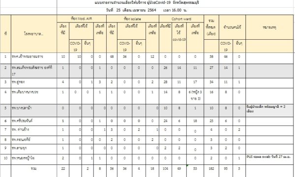 วันนี้(26 เม.ย.64) นพ.วรงค์ รุ่งเรือง นายแพทย์สาธารณสุขจังหวัดสุพรรณบุรี เปิดเผยข้อมูล ณ วันที่ 25 เมษายน 2564 เวลา 16.00 น. ว่า รพศ.เจ้าพระยายมราช มีห้อง Mod. AIR จำนวน 10 เตียง /ห้อง solate จำนวน 48 เตียง /รพ.สมเด็จพระสังฆราช องค์ที่ 17 มีห้อง Mod. AIR จำนวน 1 เตียง /รพ.อู่ทอง มีห้อง Mod. AIR จำนวน 4 เตียง /ห้อง solate จำนวน 2 เตียง/รพ.เดิมบางนางบวช 6 (หญิง 3 ชาย 3)มีห้อง Mod. AIR จำนวน 1 เตียง /ห้อง solate จำนวน 1 เตียง/รพ.บางปลาม้า รับผู้ป่วยเด็ก พร้อมญาติ = 2มีห้อง Mod. AIR จำนวน 10- เตียง /ห้อง solate จำนวน – เตียง/รพ.ศรีประจันต์ มีห้อง Mod. AIR จำนวน 1 เตียง /ห้อง solate จำนวน – เตียง/รพ. ด่านข้าง มีห้อง Mod. AIR จำนวน 1เตียง /ห้อง solate จำนวน 3 เตียง /รพ.ตอนเจดีย์ มีห้อง Mod. AIR จำนวน 1 เตียง /ห้อง solate จำนวน 2 เตียง / รพ.สามชุก มีห้อง Mod. AIR จำนวน 1 เตียง /ห้อง solate จำนวน – เตียง /และรพ.หนองหญ้าไช มีห้อง Mod. AIR จำนวน 2 เตียง /ห้อง solate จำนวน 1 เตียง รวม มีห้อง Mod. AIR จำนวน 22 เตียง /ห้อง solate จำนวน 56 เตียง