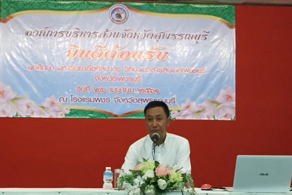 ที่ห้องประชุมองค์การบริหารส่วนจังหวัดสุพรรณบุรี นายบุญชู จันทร์สุวรรณ นายก อบจ.สุพรรณบุรี มอบหมายให้นายสุวัฒน์ จันทร์สว่าง รองนายก อบจ.ฯ นายวิทยา บุณยพัชรินทร์ ผู้ประสานงาน อบจ.สุพรรณบุรี และคณะให้การต้อนรับ อ.ดร.รุ่งทิพย์ จันทร์ธนะกุล และ อ.ธฤษณุ รอดรักษา อ.สาขารัฐประศาสนศาสตร์ มหาวิทยาลัยศิลปากร วิทยาเขตสารสนเทศเพชรบุรี จ.เพชรบุรี ในโอกาสพาคณะนักศึกษามาศึกษาดูงานการพัฒนาโครงการสร้างพื้นฐานและระบบสาธารณูปโภค และการดำเนินกิจกรรมต่างๆ เพื่อยกระดับคุณชีวิตของประชาชนในบริบท อบจ.สุพรรณบุรี พร้อมรับประทานอาหารที่โรงแรม พชร. ก่อนออกเดินทางไปยังองค์การพิพิธภัณฑ์วิทยาศาสตร์แห่งชาติ จ.ปทุมธานี