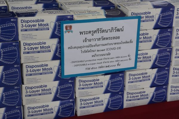 มอบหน้ากากอนามัยจำนวน 10,500 ชิ้น และแอลกอฮอล์/เจลล้างมือ จำนวน 200 ลิตร และเมื่อวันที่ 27 เม.ย.64 เวลา 10.30 น. พระครูศรีรัตนาภิวัฒน์ เจ้าอาวาสวัดพระลอย/รองเจ้าคณะอำเภอเมืองสุพรรณบุรี/ประธาน กต.ตร.สภ.เมืองสุพรรณบุรี มอบหน้ากากอนามัยให้กับตำรวจภูธรจังหวัดสุพรรณบุรี จำนวน 500 กล่อง 25,000 ชิ้น (DISPOSABLE protective mask จำนวน 140 กล่อง 7,000 ชิ้น และ DISPOSABLE 3-Layer mask จำนวน 360 กล่อง 18,000 ชิ้น)