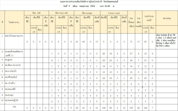 วันนี้ (5 พ.ค.64) คณะกรรมการโรคติดต่อจังหวัดสุพรรณบุรี เปิดเผยข้อมูล สถานการณ์การใช้เตียงประจำวันที่ 4 พฤษภาคม 2564 เวลา 16:00 น จำนวนเตียงทั้งหมด 195 เตียง. มีผู้ป่วย covid -19. ทั้งหมด 142 คน คิดเป็นร้อยละ 72.82 ของ จำนวนเตียงทั้งหมด คงเหลือเตียงพร้อมให้บริการ 42 เตียง เมื่อจำแนกผู้ป่วยตามระดับความความรุนแรง ดังนี้ 1 ระดับ asymptomatic +mild จำนวน 117 คน คิดเป็นร้อยละ 82.40 ของผู้ป่วยทั้งหมด