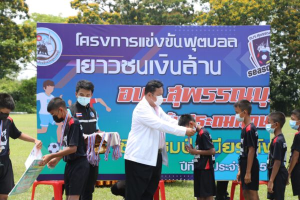 นายบุญชู จันทร์สุวรรณ นายก อบจ.สุพรรณบุรี ผู้ริเริ่มโครงการฟุตบอลเยาวชนเงินล้าน อบจ.สุพรรณบุรี ลีกคัพ กล่าวแสดงความยินดีกับ น.ส.ทิวากร ดวงแก้ว ผอ.รร.วัดสามจุ่น ต.ดอนปรู อ.ศรีประจันต์ จ.สุพรรณบุรี และนายเจษฎา บุญเรืองรอด อดีตนักเตะทีมสุพรรณบุรี เอฟ ซี ผู้ฝึกสอนกีฬาฟุตบอล ทีม โรงเรียนวัดสามจุ่น หลังคว้าแชมป์ การแข่งขันฟุตบอลเยาวชนเงินล้าน อบจ.สุพรรณบุรี ชิงแชมป์จูเนียร์คัพ ระดับประถมศึกษา ปีที่ 7 ว่า ถือเป็นแรงบันดาลใจให้เด็กๆมาเล่นกีฬา คนเรามีความเก่งไม่เหมือนกัน เด็กที่อยู่บ้านนอกอาจจะเรียนไม่เก่ง แต่เขาอาจจะมีความสามารถเล่นฟุตบอลเก่ง เขาก็มีราคามีมูลค่าได้