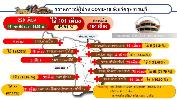 ส่วน Local Quarantine Suphanburi แห่งที่ 2 ข้อมูล ณ วันที่ 16 พฤษภาคม 2564 เวลา 18.00 น. จำนวนห้องพักทั้งหมด 38 ห้อง พักใช้เพื่อทำลายเชื้อ 1 ห้องใช้ได้ 5ห้อง ขณะที่ Local Quarantine Suphanburi แห่งที่ 1 อยู่ระหว่างการปรับปรุง