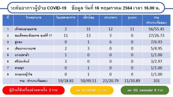 วันนี้( 17 พ.ค.64) คณะกรรมการโรคติดต่อจังหวัดสุพรรณบุรี เปิดเผยข้อมูลสถานการณ์การใช้เตียงประจำวันที่ 16 พฤษภาคม 2564 เวลา 16:00 น จำนวนเตียงทั้งหมด 220 เตียง. มีผู้ป่วย covid -19. ทั้งหมด 101 คน คิดเป็นร้อยละ 45.91 ของ จำนวนเตียงทั้งหมด คงเหลือเตียงพร้อมให้บริการ 104 เตียง เมื่อจำแนกผู้ป่วยตามระดับความความรุนแรง ดังนี้