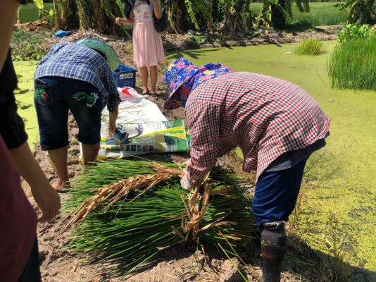 จากนั้นได้จัดกิจกรรมการถ่ายทอดความรู้ให้กับชุมชนครั้งนี้ ได้รับความร่วมมือจากผู้ใหญ่บ้านหมู่ที่ ๘ และ สมาชิกกลุ่มจักสานในชุมชน จำนวน ๒๐ คน ร่วมกันแลกเปลี่ยนและเสนอแนวความคิดต่อการจักสานผลิตภัณฑ์จากต้นแห้ว