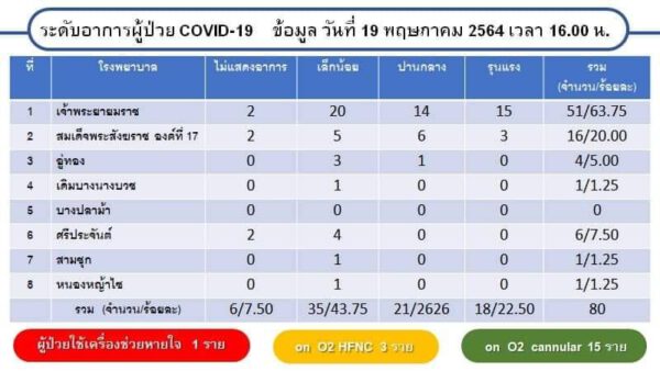 วันนี้ (20 พ.ค.64) คณะกรรมการโรคติดต่อจังหวัดสุพรรณบุรี เปิดเผยข้อมูลสถานการณ์การใช้เตียงประจำวันที่ 19 พฤษภาคม 2564 เวลา 16:00 น จำนวนเตียงทั้งหมด 233 เตียง. มีผู้ป่วย covid -19. ทั้งหมด 80 คน คิดเป็นร้อยละ 34.33 ของ จำนวนเตียงทั้งหมด คงเหลือเตียงพร้อมให้บริการ 145 เตียง รพ.สนาม 100 เตียง เมื่อจำแนกผู้ป่วยตามระดับความความรุนแรง ดังนี้
