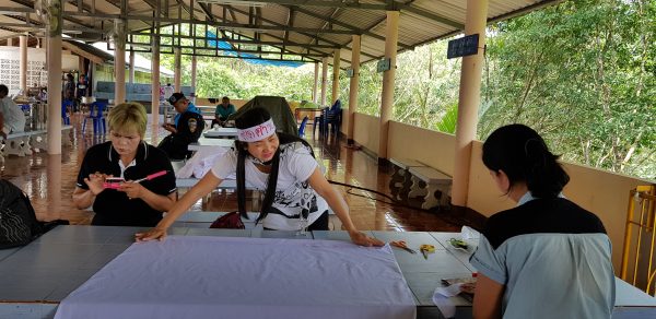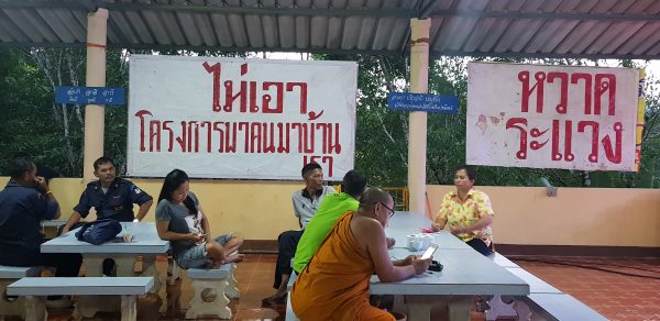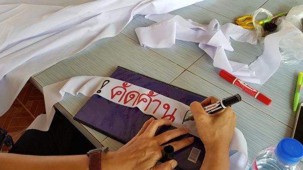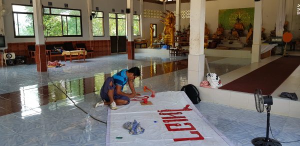 ชาวบ้านเดินทางไปที่วัดลีนานนท์ ตำบลสุคิริน เพื่อช่วยกันเขียนป้ายข้อความ และจัดเตรียมสถานที่ ก่อนรวมตัวแสดงพลังคัดค้าน โครงการตั้งหมู่บ้านและจัดสรรที่ดินทำกินในอำเภอสุคิริน จังหวัดนราธิวาส เพื่อรองรับ “อดีตผู้หลงผิด” ที่เข้าร่วมโครงการพาคนกลับบ้าน ตามแนวคิดของแม่ทัพภาคที่ 4 ในวันพรุ่งนี้ (10 พ.ค.61)
