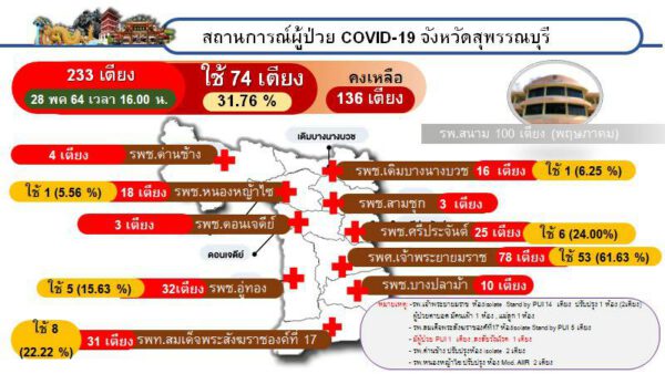 วันนี้ (29 พ.ค.64) คณะกรรมการโรคติดต่อจังหวัดสุพรรณบุรี เปิดเผยข้อมูลสถานการณ์การใช้เตียงประจำวันที่ 28 พฤษภาคม 2564 เวลา 16:00 น จำนวนเตียงทั้งหมด 233 เตียง. มีผู้ป่วย covid -19. ทั้งหมด 74 คน คิดเป็นร้อยละ 31.76 ของ จำนวนเตียงทั้งหมด คงเหลือเตียงพร้อมให้บริการ 136 เตียง รพ.สนาม 100 เตียง เมื่อจำแนกผู้ป่วยตามระดับความความรุนแรง ดังนี้