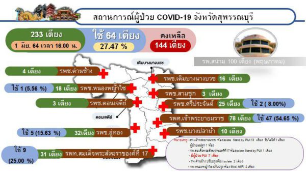 ส่วน Local Quarantine Suphanburi แห่งที่ 2 ข้อมูล ณ วันที่ 1 มิถุนายน 2564 เวลา 18.00 น. จำนวนห้องพักทั้งหมด 38 ห้อง ใช้ได้ทันที 1 ห้อง ขณะที่ Local Quarantine Suphanburi แห่งที่ 1 อยู่ระหว่างการปรับปรุง