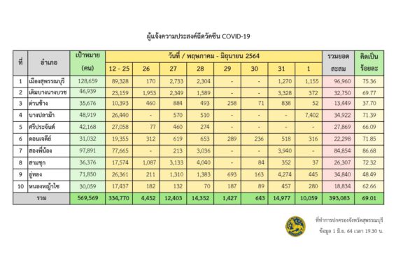 ซึ่งขณะนี้จำนวนผู้ลงทะเบียนขอรับการฉีดวัคซีนโควิด 19 เมื่อวันที่ 1 มิถุนายน 2564 เวลา 19.30 น.มียอดรวมสะสม 393,083 คน คิดเป็นร้อยละ 69.01 อย่างไรก็ตาม หากต้องการปรึกษาสุขภาพ โควิด-19 สอบถามได้ที่ สำนักงานสาธารณสุขจังหวัดสุพรรณบุรี โทร 035-454066 ในวัน และเวลาราชการ และ 081-9865-617 /081-9428-882 เวลา 08.30-22.00 น.